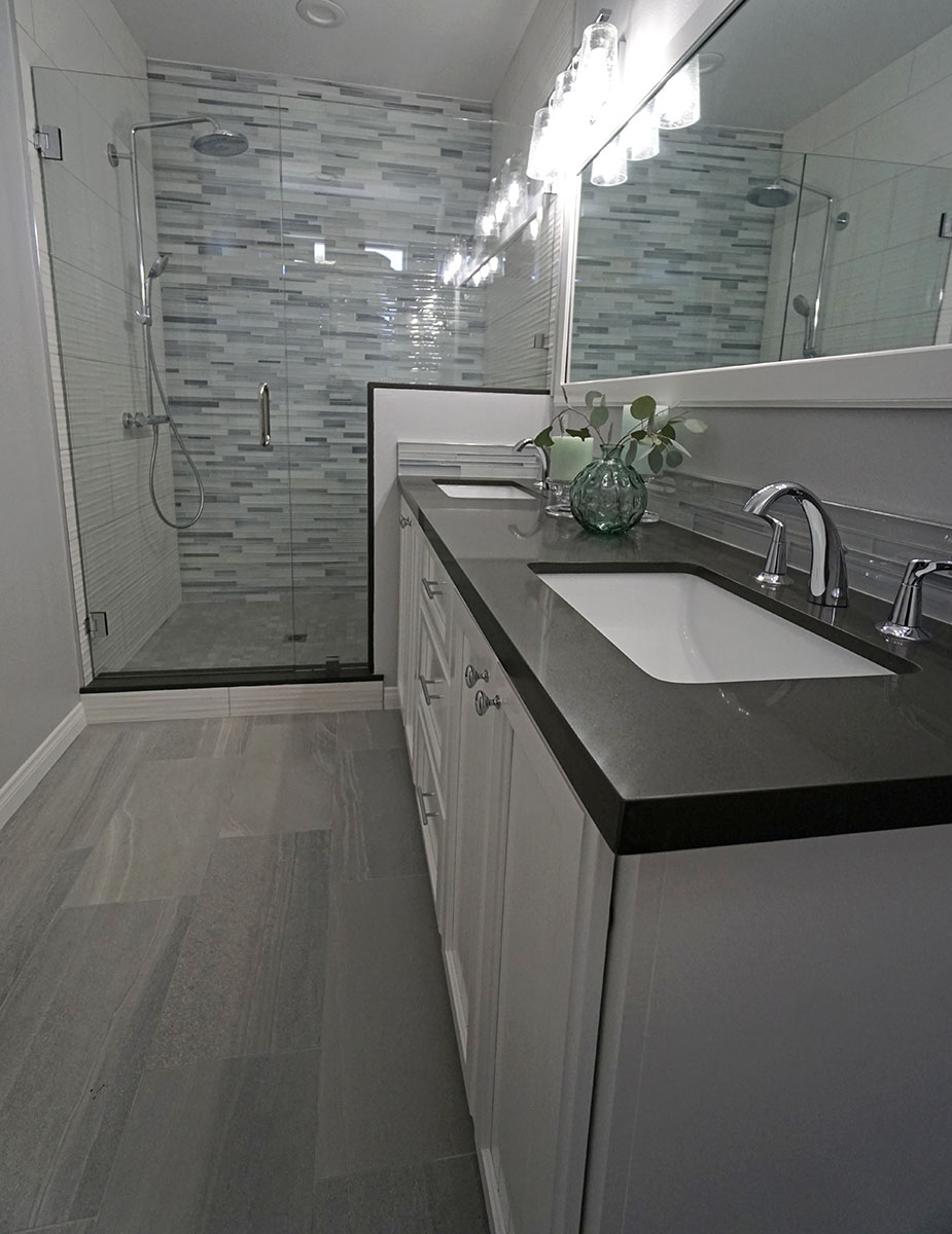 Our latest master bathroom remodel brings out all of the the cool and calming vibes. We are loving the huge walk in shower with a combination of textured tile, stacked glass tile, quartz and porcelain 2×2’s accompanied with a floating bench for total relaxation. We also got rid of the outdated jacuzzi tub and added a large custom linen closest, something this family was unfortunately missing in their home’s original layout. A custom double vanity to match makes this bathroom come together perfectly